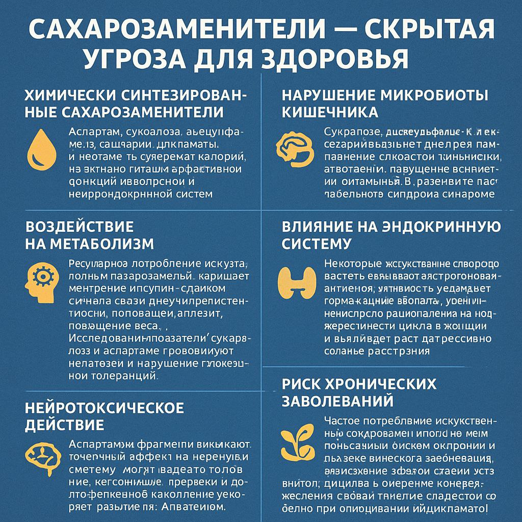 Химически синтезированные сахарозаменители не являются безопасной альтернативой сахару. Их постоянное применение способно нарушить нейроэндокринные механизмы регуляции аппетита, повредить микробиоту кишечника и спровоцировать метаболические и онкологические заболевания.