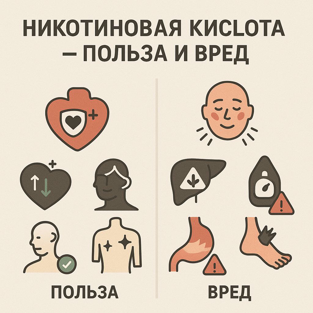 В терапевтических дозах никотиновая кислота — важный витамин с выраженным сосудорасширяющим и гиполипидемическим эффектом. Однако при самолечении и передозировке она становится потенциально токсичной и может вызвать нарушения работы печени и обмена веществ. Оптимальное применение — под контролем врача с учётом биохимических анализов.