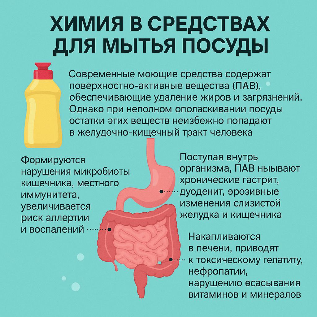 Современные моющие средства содержат поверхностно-активные вещества (ПАВ), обеспечивающие удаление жиров и загрязнений. Однако при неполном ополаскивании посуды остатки этих веществ неизбежно попадают в желудочно-кишечный тракт человека. Основными компонентами большинства средств являются анионные, неионогенные и амфотерные ПАВ, в частности лаурилсульфат натрия, лауретсульфат натрия и этоксилаты спиртов. Эти соединения не разрушаются полностью при контакте с водой и способны длительно сохраняться на поверхности посуды, особенно пластиковой и стеклянной.