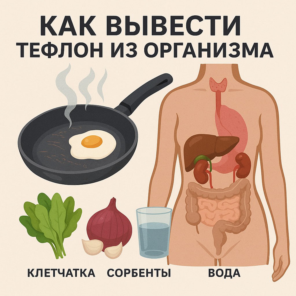 Тефлон — это политетрафторэтилен (PTFE), сам по себе инертный, но при производстве и разрушении покрытия образуются PFOA, PFOS и другие PFAS — так называемые «вечные химикаты». Эти вещества не разрушаются в природе и практически не выводятся организмом. Основной путь поступления — через пищу со старых, поцарапанных тефлоновых поверхностей, через нагрев покрытия выше 250–300 °C, через питьевую воду, загрязнённую PFAS, а также через воздух при нагреве старой кухонной утвари. PFAS очень устойчивы, легко связываются с белками крови и накапливаются в организме десятилетиями. Главное место накопления — печень, где PFAS вмешиваются в работу ферментов детоксикации, нарушают обмен липидов и создают фон хронического воспаления. Второй депо — почки: они пытаются вывести PFAS, но большая часть задерживается в почечной ткани, создавая длительную фильтрационную нагрузку. Далее PFAS откладываются в крови (связывание с альбумином), в щитовидной железе (конкурируют с транспортом тироксина), в жировой ткани (сохраняются даже при похудении) и в лимфоидной системе, где снижают активность иммунного ответа. Доказано, что PFAS увеличивают риск нарушений работы печени и щитовидной железы, влияют на артериальное давление, уменьшают фертильность, ухудшают иммунную реакцию у детей и взрослых и ассоциируются с ростом некоторых типов опухолей в долгосрочных наблюдениях. Период полувыведения варьирует от 3 до 9 лет, поэтому ключевая задача — не допустить дальнейшего поступления и ускорить естественные пути выведения. Для снижения нагрузки важно избегать перегретых тефлоновых поверхностей, заменить старую посуду на сталь или керамику, увеличить потребление воды, растительной клетчатки и природных сорбентов, которые связывают и выводят PFAS через кишечник, уменьшая их циркуляцию в крови.