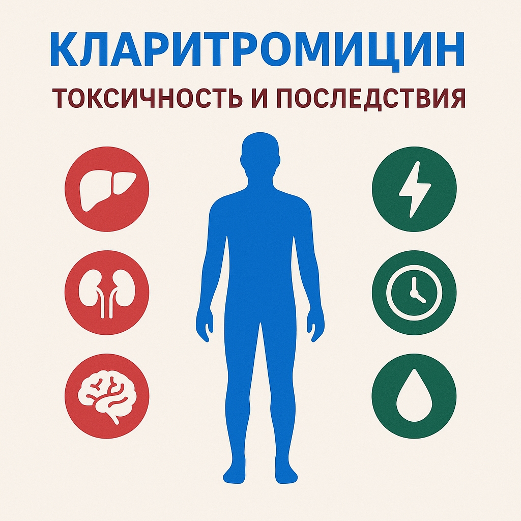 Токсичность кларитромицина определяется тремя основными механизмами: кардиотоксическим влиянием, гепатотоксичностью и нейротоксическими эффектами. Препарат удлиняет интервал QT на ЭКГ, что связано с блокадой калиевых каналов кардиомиоцитов и увеличивает риск опасной аритмии torsades de pointes. Гепатотоксичность связана с формированием токсичных метаболитов и холестатическим повреждением печёночной ткани, особенно у пациентов с дефицитом глутатиона, алкогольной нагрузкой и исходными заболеваниями печени. Нейротоксические проявления включают головокружение, тревогу, бессонницу и даже психотические реакции, что объясняется способностью препарата нарушать баланс нейромедиаторных систем.